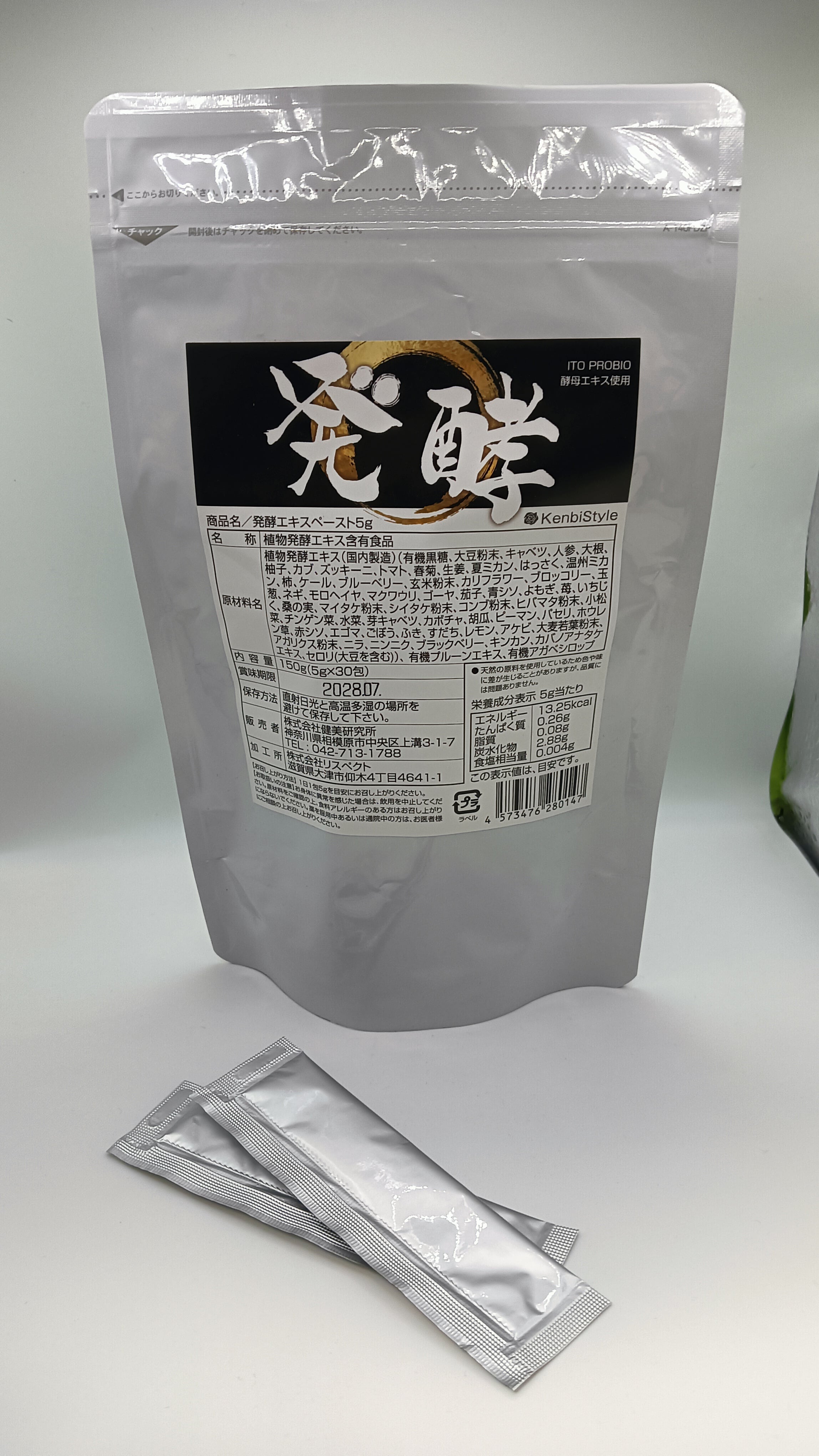 原材料:有機黒糖、大豆粉末、キャベツ、人参、大根、柚子、カブ、ズッキーニ、トマト、春菊、生姜、夏みかん、はっさく、温州みかん、柿、ケール、ブルーベリー、玄米粉末、カリフラワー、ブロッコリー、玉葱、ネギ、モロヘイヤ、マクワウリ、ゴーヤ、茄子、青シソ、よもぎ、苺、いちじく、桑の実、マイタケ粉末、シイタケ粉末、コンブ粉末、ヒバマタ粉末、小松菜、チンゲン菜、水菜、芽キャベツ、カボチャ、胡瓜、ピーマン、パセリ、ホウレン草、赤シソ、エゴマ、ゴボウ、ふき、すだち、レモン、アケビ、大麦若葉粉末、アガリスク粉末、ニラ、ニンニク、ブラックベリー、キンカン、カバノアナタケエキス、セロリ(大豆を含む)、有機プルーンエキス、有機アガベシロップ